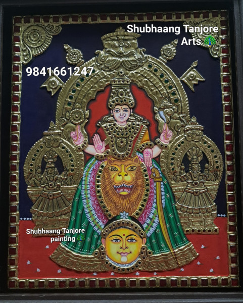 This Painting is 100% handmade made with original 22 carat gold leaves and authentic Jaipur gems by skilled artisans in Thanjavur. Beautiful gift for any auspicious occasion.