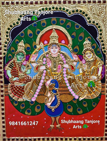 He is often depicted seated on his divine vehicle, the peacock, symbolizing the destruction of ego and negativity.