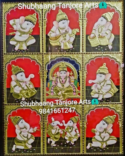 This exquisite Tanjore painting showcases Ganesha in nine delightful forms, often referred to as Navanatiya Ganapathy. Each panel beautifully portrays Ganesha dancing or playing different musical instruments, symbolizing joy, creativity, and divine rhythm.