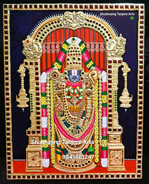 Lord Perumal, the preserver and protector of the universe. Adorned with his traditional symbols—the conch (Shankha), discus (Sudarshana Chakra) - he represents harmony, wisdom, and eternal protection. Lord Perumal inspires devotion, peace, and prosperity, making his depiction in Tanjore art a sacred treasure of faith.